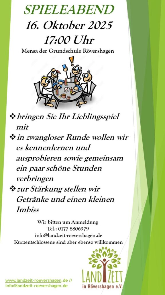 Am 16. Oktober ist wieder Spielezeit in der Mensa der Grundschule. Los geht’s ab 17.00 Uhr. Es können Spiele mitgebracht werden, oder man macht entspannt bei anderen mit und lässt sich von mitgebrachten Spielen überraschen und inspirieren. Wir sind sicher, es wird wieder ein kurzweiliger Abend.
